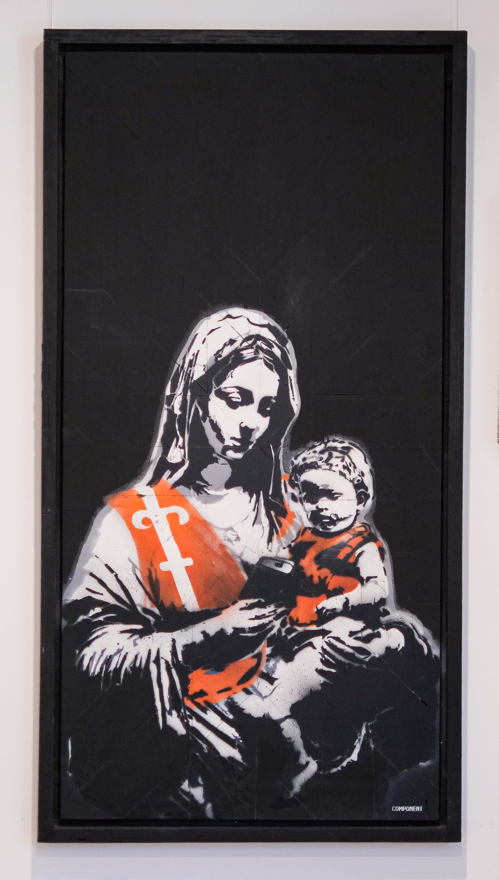 This artwork, created on a discovered cut up sections of signs, seamlessly merges components of urban street art with a poignant social commentary. "Digital Refuge" presents a captivating contrast between conventional iconography and modern-day realities. The found boat section metaphorically symbolises the condition of our interconnected digital realm. The artwork prompts contemplation about the paradoxical nature of seeking solace and aid in an era dominated by digital advancements, raising inquiries about the potential erosion of authentic human connections in the midst of our incessant virtual interactions.