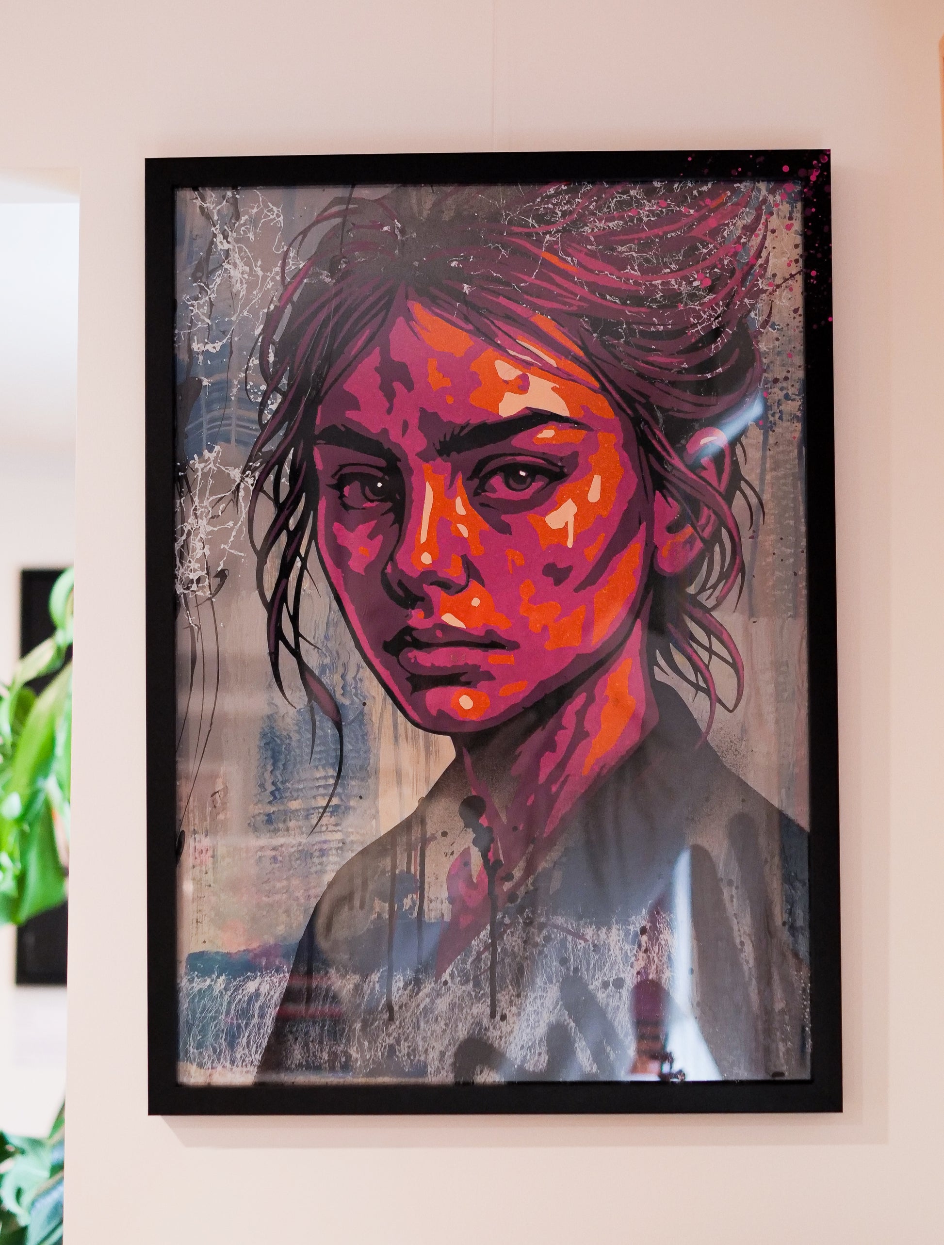 Original artwork. 6-layer stencil / mixed media on art card, black frame.
