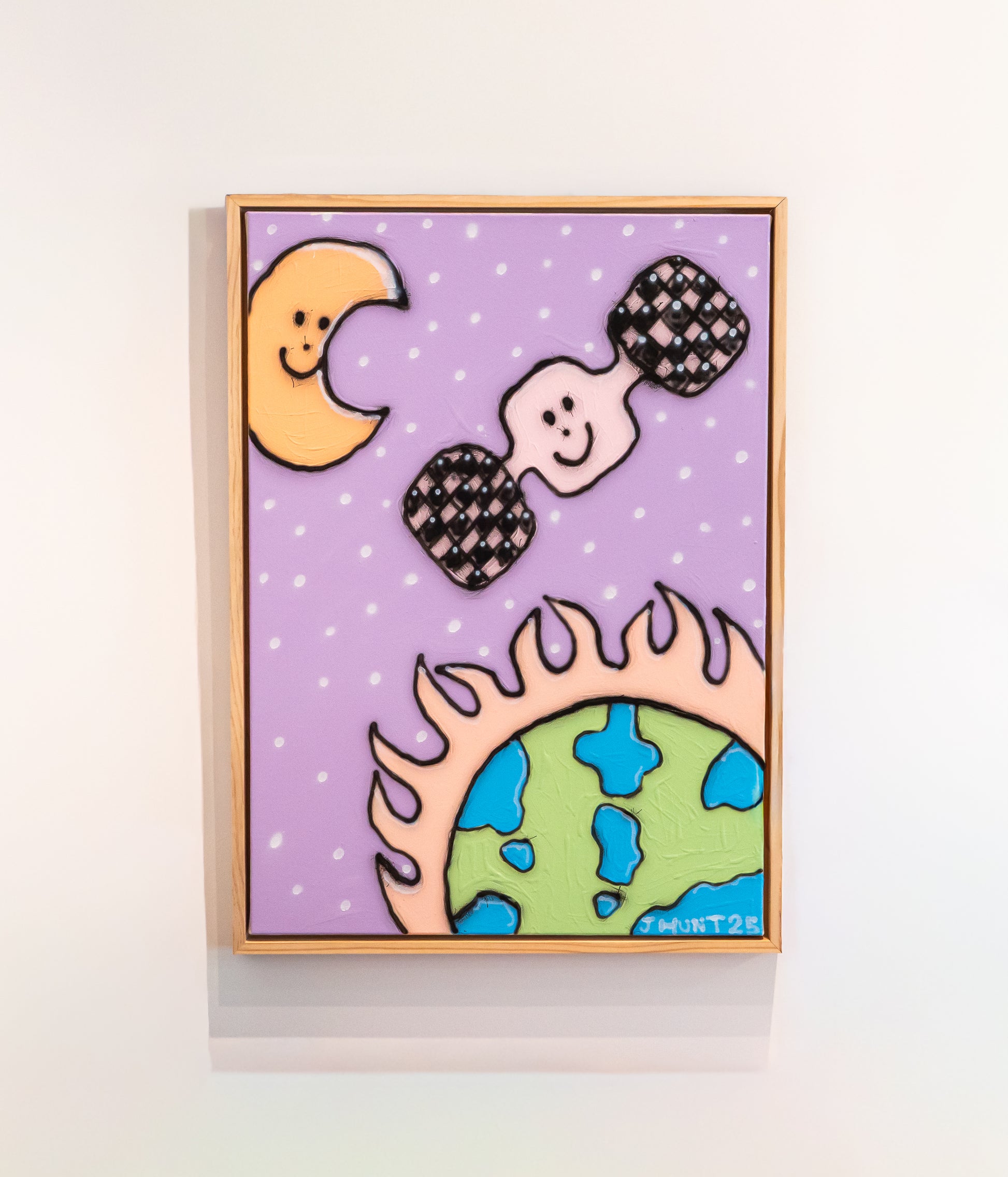 The Earth is on fire, cities and forests aflame, but everyone is smiling anyway. Bright, bold colours pulse across the canvas, full of life and joy, while a lone Starlink satellite hovers above like a small, wry joke at our cleverness. It’s playful and alarming all at once. Reminding us that happiness doesn’t vanish just because the world is fragile. We can still laugh, but we can’t forget what’s burning beneath the surface. Kind of like those situations where everything is just so fucked and all.