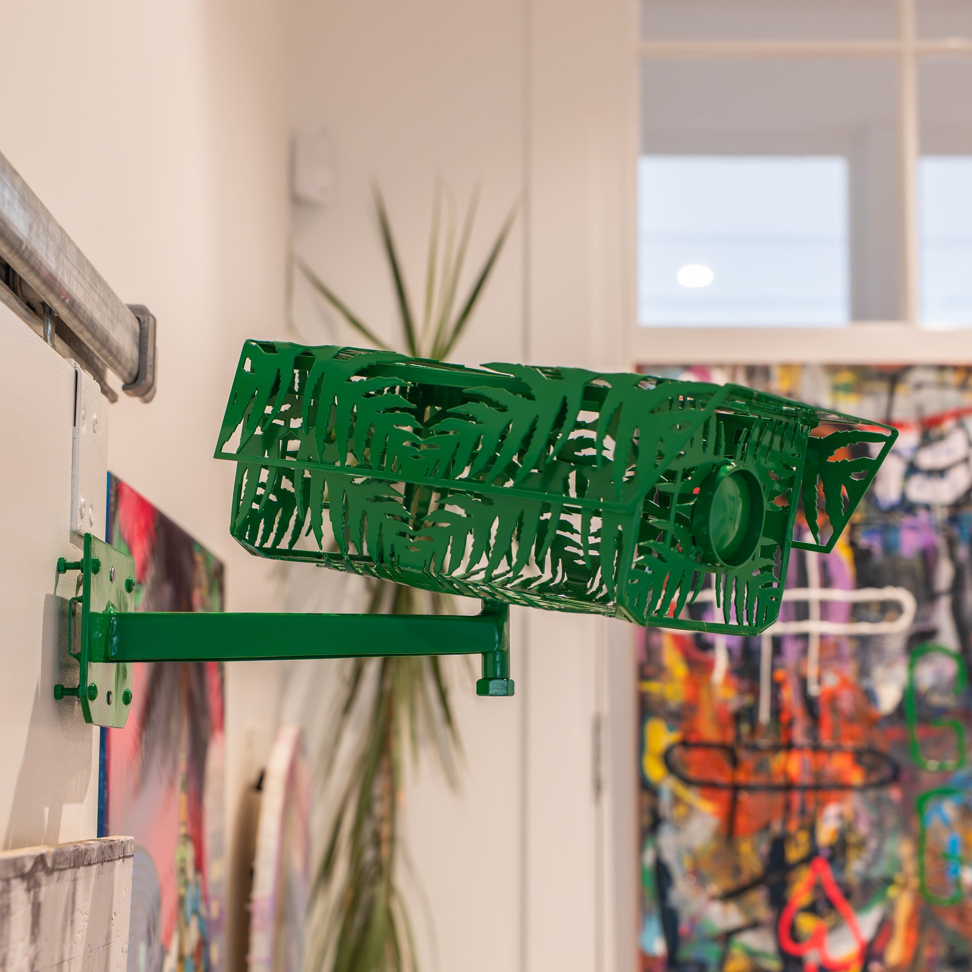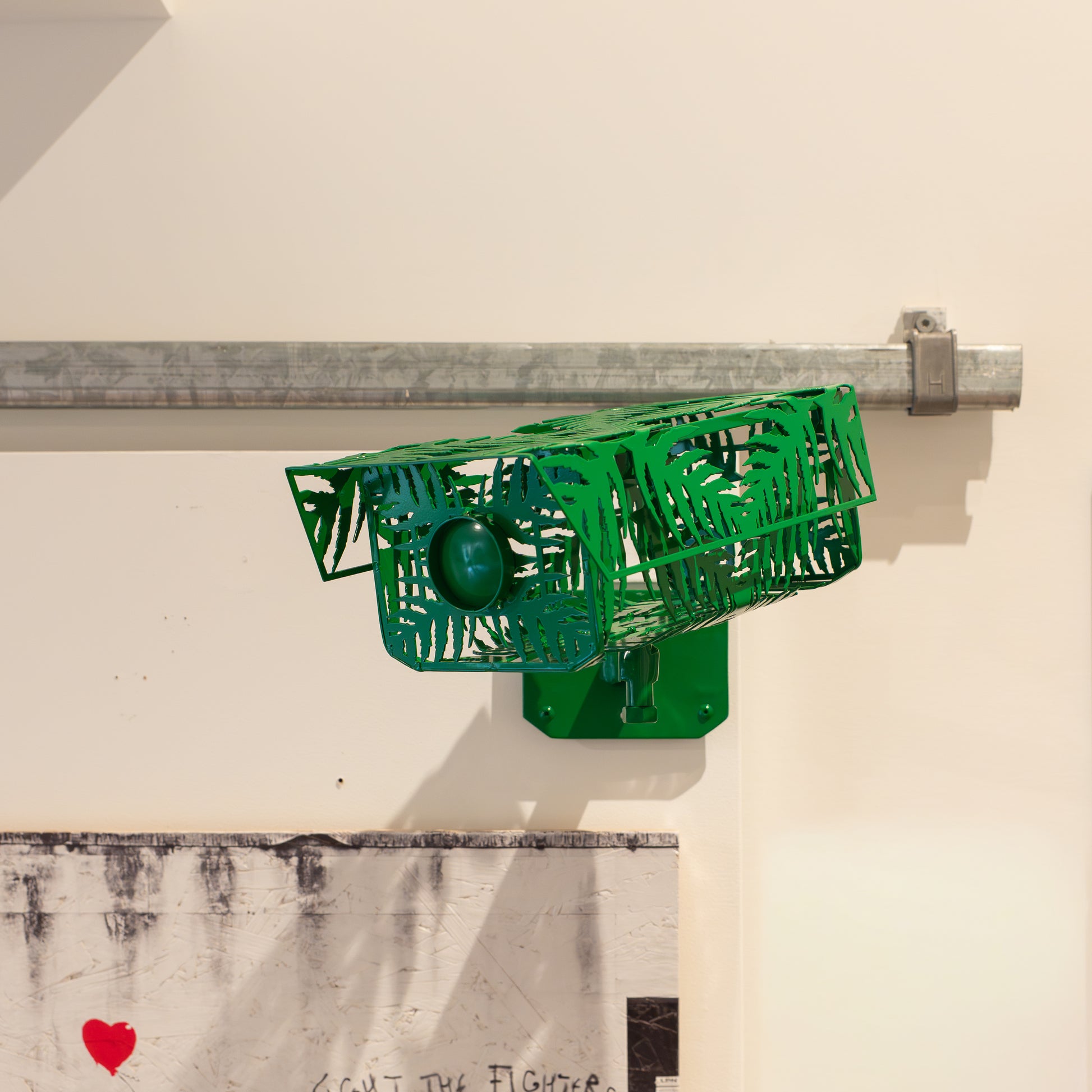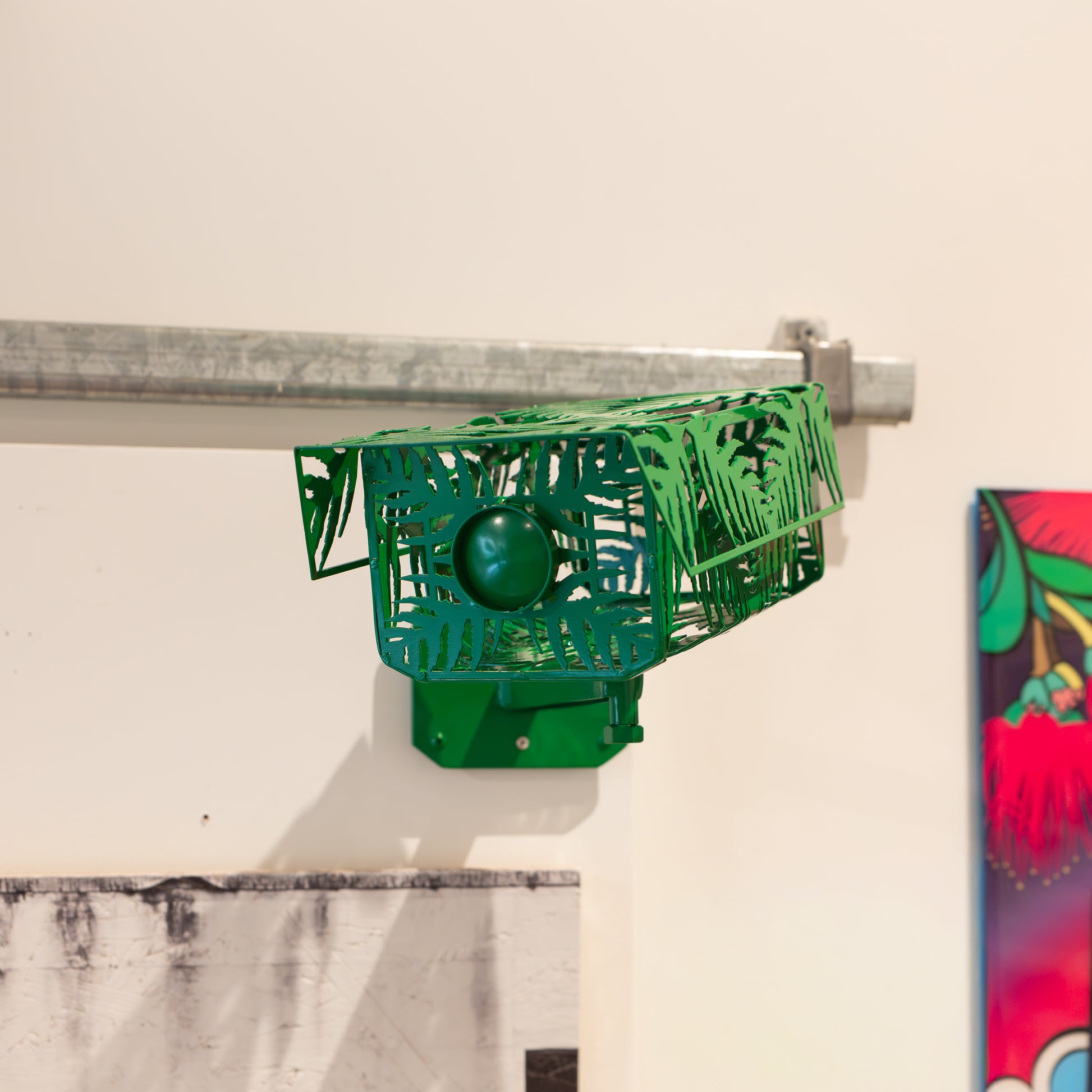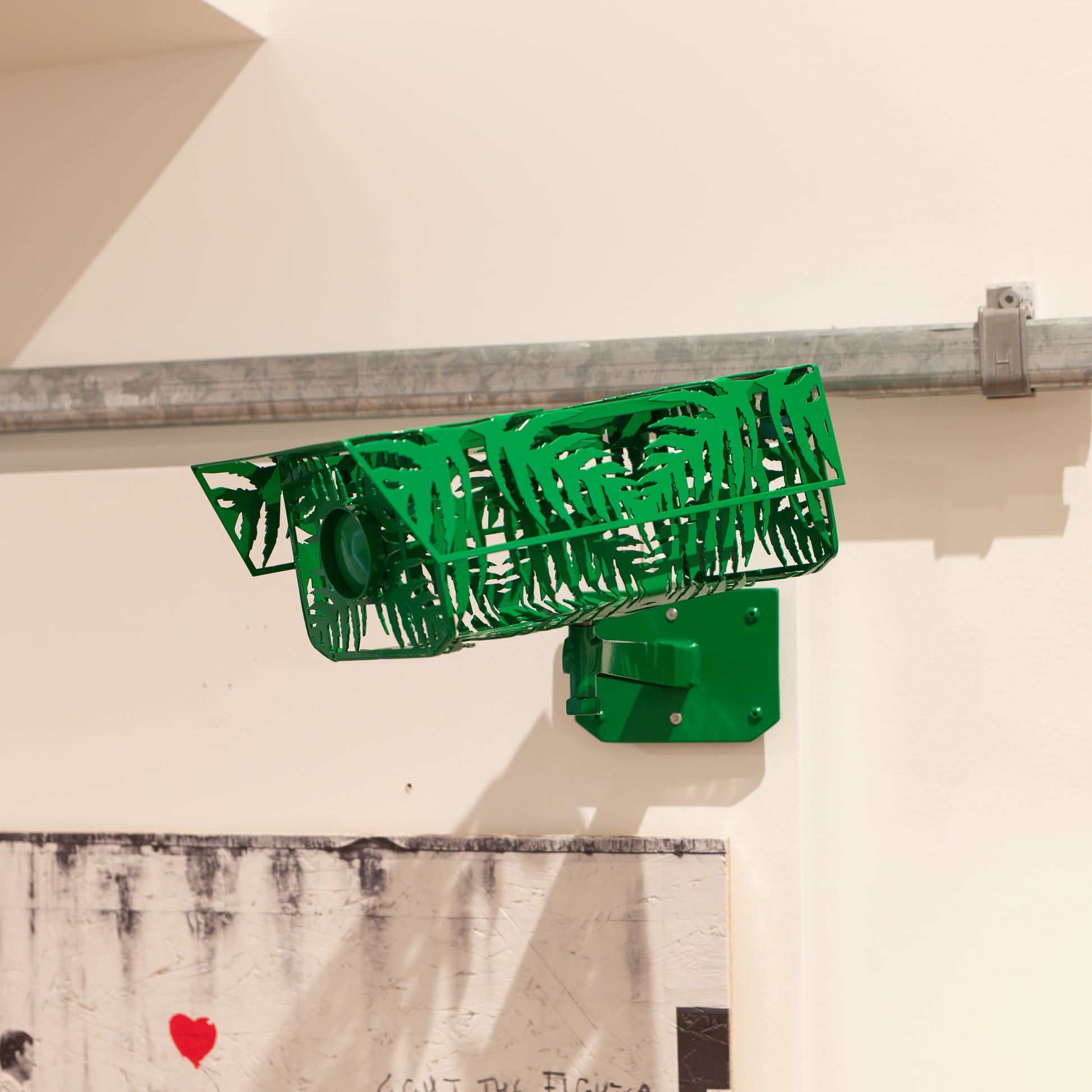 Fern (Huruwhenna) Security Camera. 1 of 5. Laser cut stainless steel fern design, stainless steel extrusion with powder-coat render.